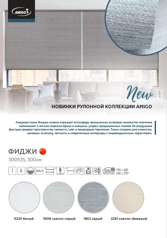 Ажурная ткань Фиджи словно отражает атмосферу тропических островов: волнистое плетение напоминает о легком морском бризе и изящных узорах традиционных тканей. Ее воздушная фактура придает пространству свежесть, свет и природную гармонию. Ткань создана для клиентов, ценящих экзотику, легкость и современные интерьеры с индивидуальным характером.