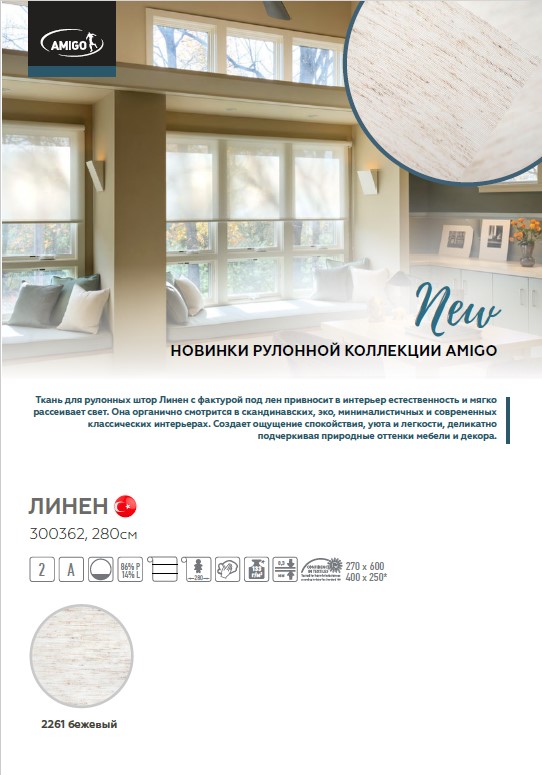 Ткань для рулонных штор Линен с фактурой под лен привносит в интерьер естественность и мягко