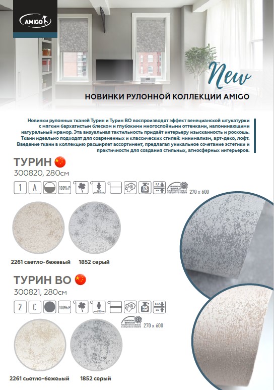 Новинки рулонных тканей Турин и Турин BO воспроизводят эффект венецианской штукатурки с мягким бархатистым блеском и глубокими многослойными оттенками, напоминающими натуральный мрамор. Эта визуальная тактильность придаёт интерьеру изысканность и роскошь.