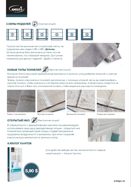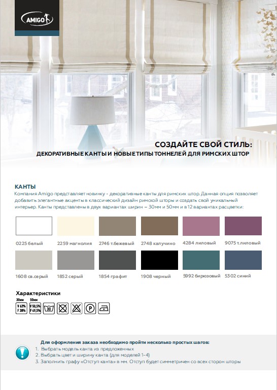 Компания Amigo представляет новинку - декоративные канты для римских штор. Данная опция позволяет