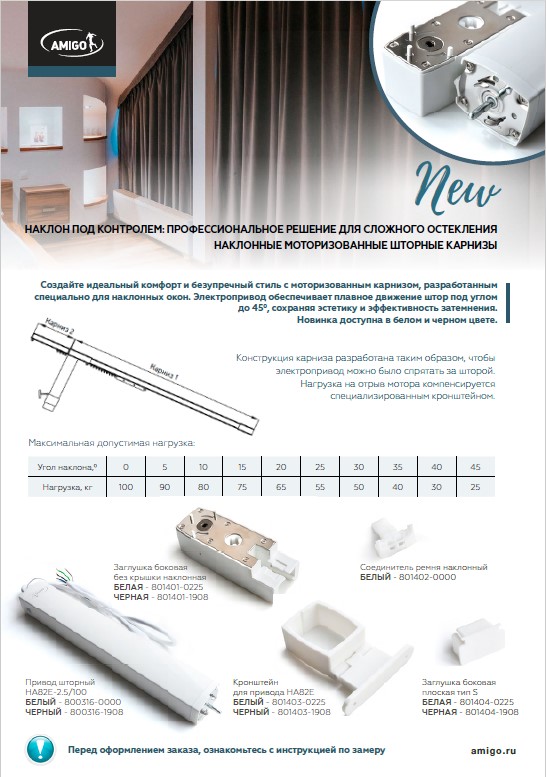 Создайте идеальный комфорт и безупречный стиль с моторизованным карнизом, разработанным специально для наклонных окон. Электропривод обеспечивает плавное движение штор под углом до 45⁰, сохраняя эстетику и эффективность затемнения. Новинка доступна в белом и черном цвете.